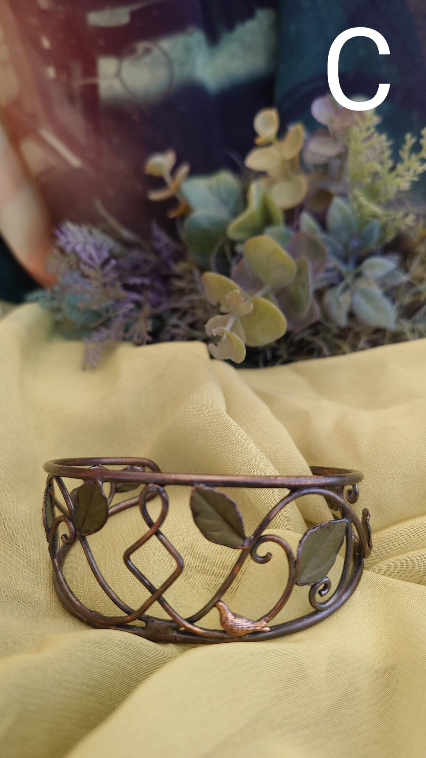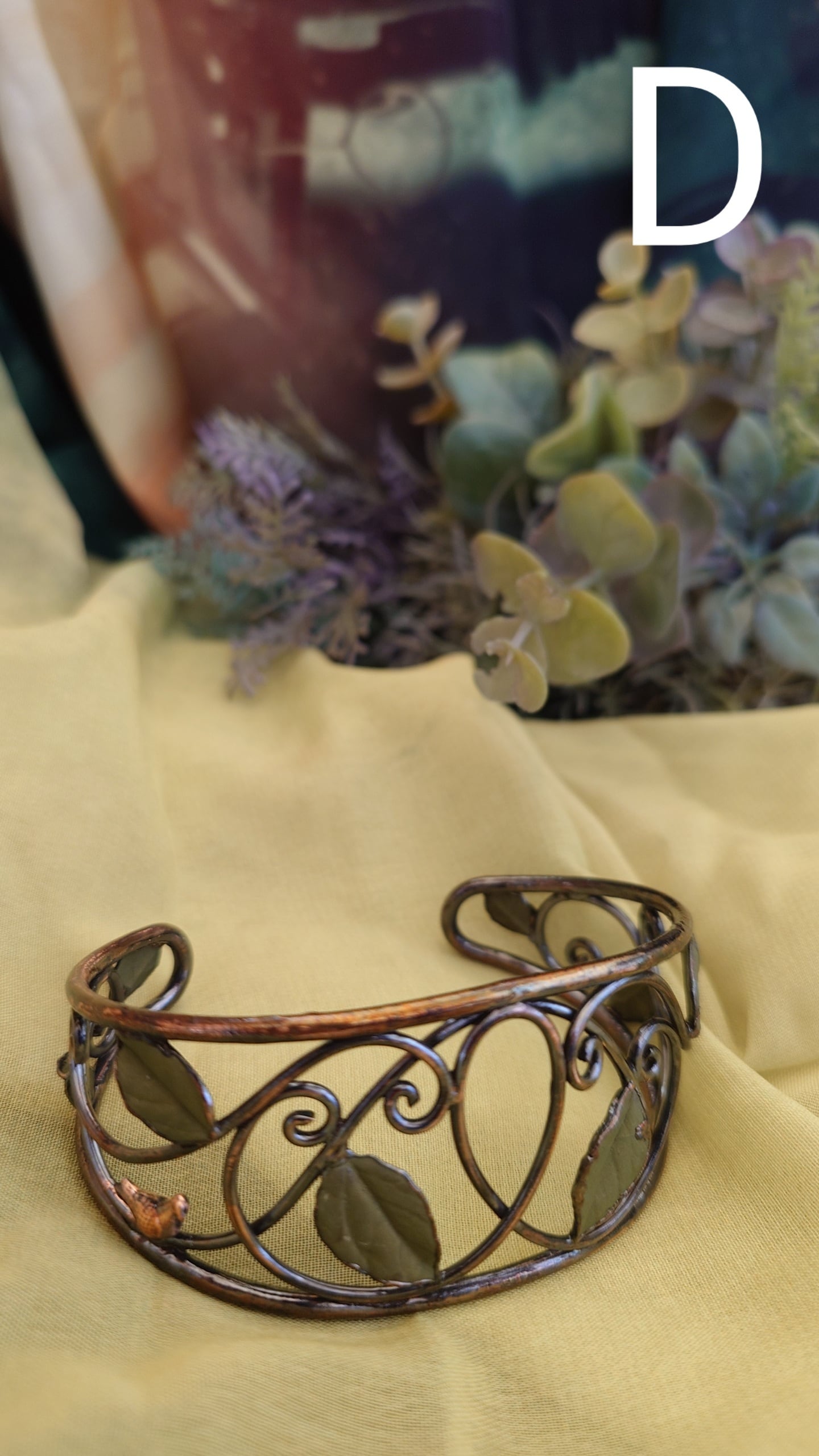 透かし蔦に小鳥が遊ぶ、古い窓辺のひと時を切り抜いた腕輪です。
