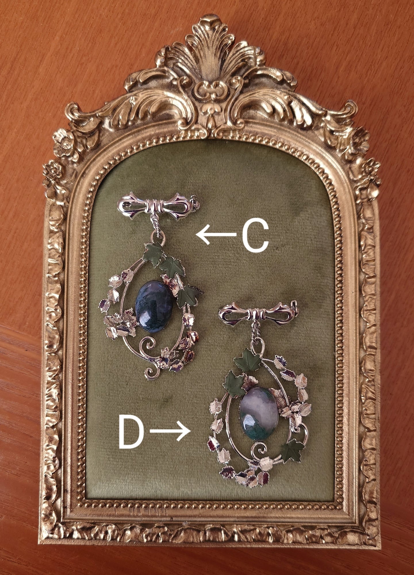 森の細工師が、常緑を閉じ込めた石と氷彩の蔦とで拵えた小さなブローチです。